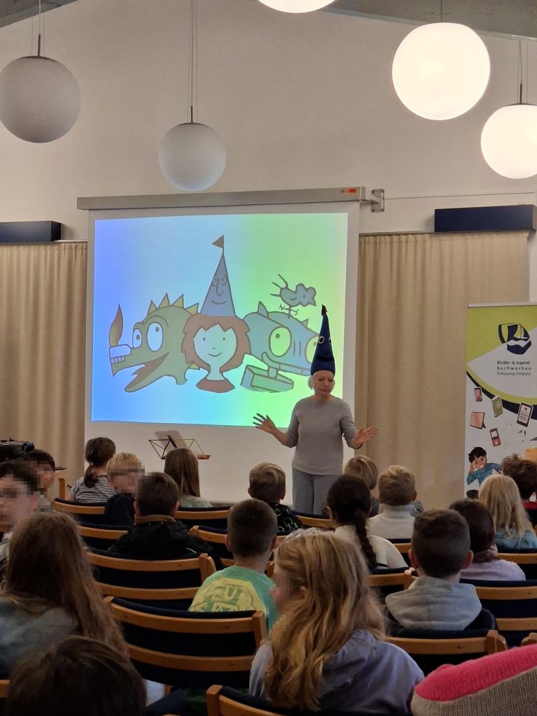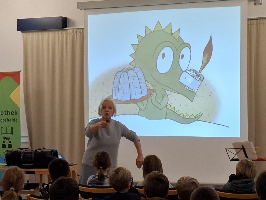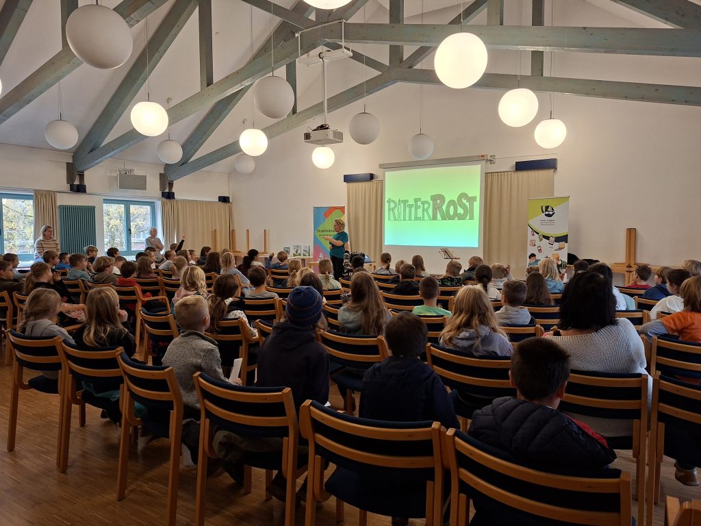 Im Rahmen der Kinder- und Jugendbuchwochen wurden die dritten Klassen von der Bargteheider Stadtbibliothek zu einem ganz besonderen Termin eingeladen: Patricia Prawit, selbst seit über 25 Jahren die Stimme des Burgfräulein Bö aus den Ritter-Rost-Musicals und -Hörspielen, präsentierte im Saal des Stadthauses die Geschichte: „Ritter Rost kommt zur Schule“. Frau Prawit sprach in ihrer Lesung jede Figur, sei es Ritter Rost oder Koks der Feuerdrache, mit einer eigenen Stimme, sang insgesamt sieben der elf Songs dieses Musicals und band dabei in den Refrains die Kinder mit ein. Das war ein herausragendes Erlebnis!! Vielen Dank an Frau Prawit für dies One-woman-Show und an die Bargteheider Stadtbibliothek!