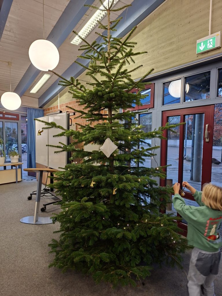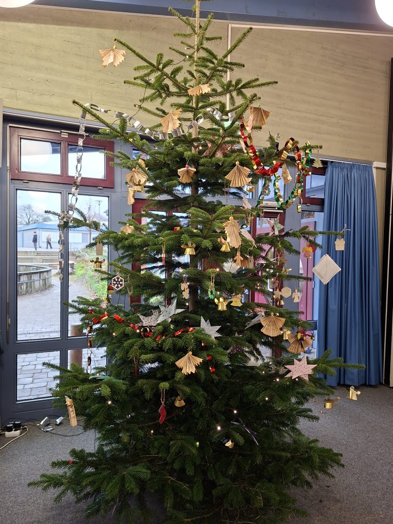 Jeden Freitag vor dem 1. Advent findet in unserer Schule das Adventsbasteln statt. Die hier hergestellten Kunstwerke sollen nicht nur den Klassenraum verschönern, sondern auch unseren Schul-Tannenbaum in der Aula schmücken. So sieht unser Baum jedes Jahr anders aus und in diesem Jahr ist er wieder besonders schön geworden.